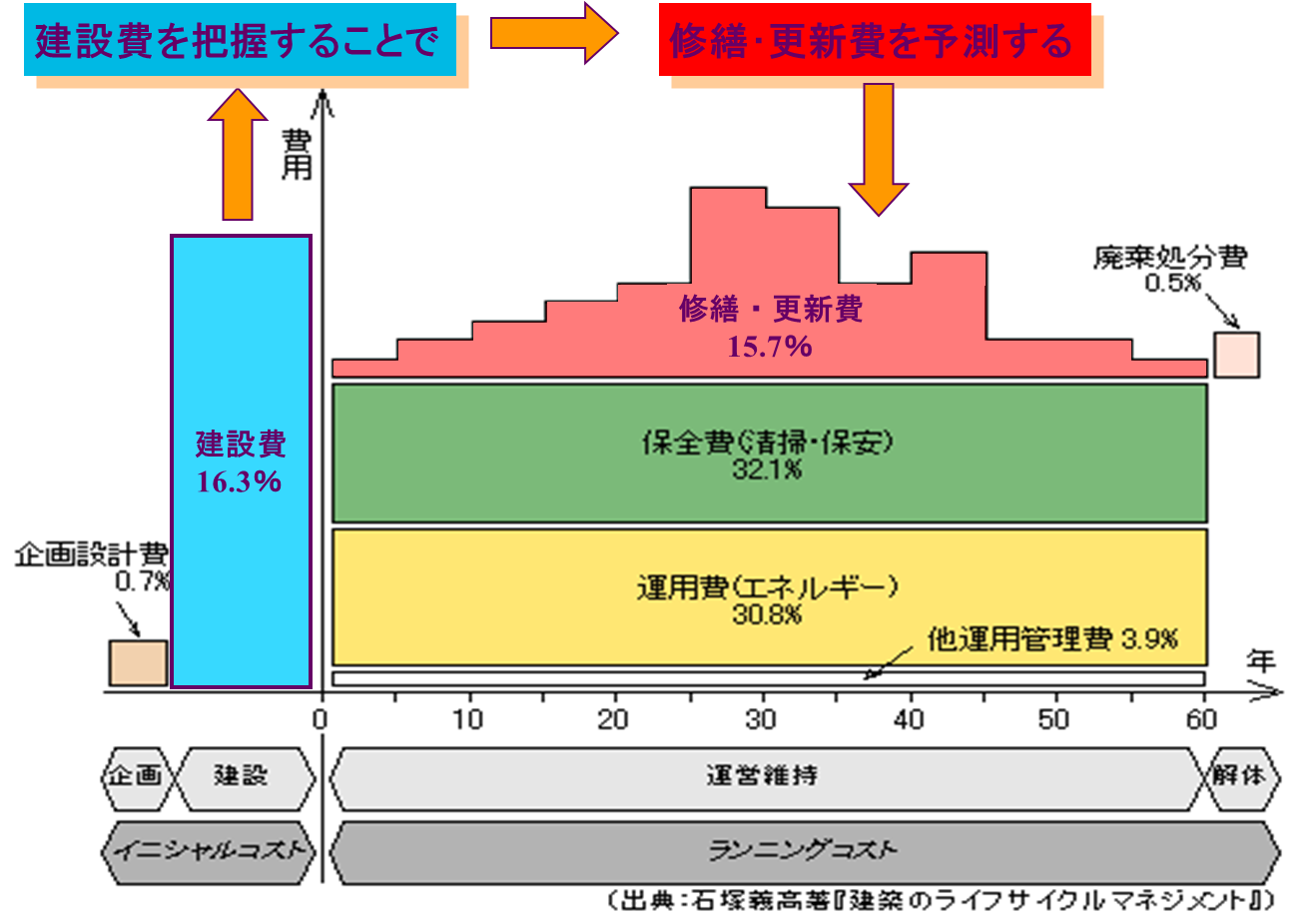 建物は建設後は運用費(エネルギー)、保全費(清掃・保安)、修繕・更新費が継続的に掛かり、60年間の建物生涯ではそのランニングコストは建設費の4.8倍に、修繕・更新費だけでも建設費と同等の金額が掛かると言われています。