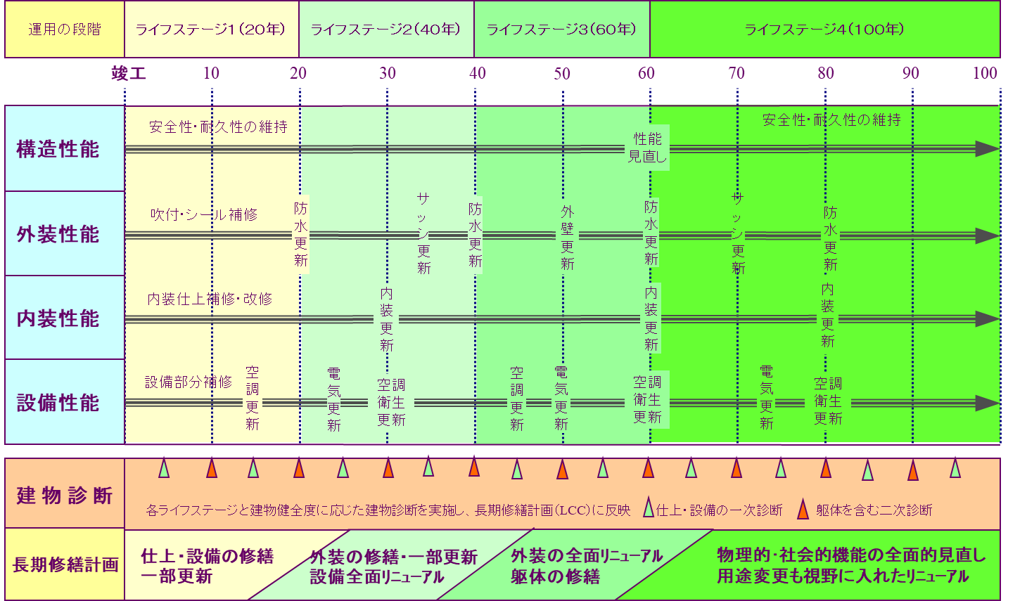 建物の修繕・更新サイクルは部位によってサイクル年数が異なりますが、ほぼ20年毎に大規模修繕時期が訪れてきます。必要最小限のコストで物理的劣化を防止するには、定期的な建物診断と先を見通した修繕計画(長期修繕計画)が必要です。