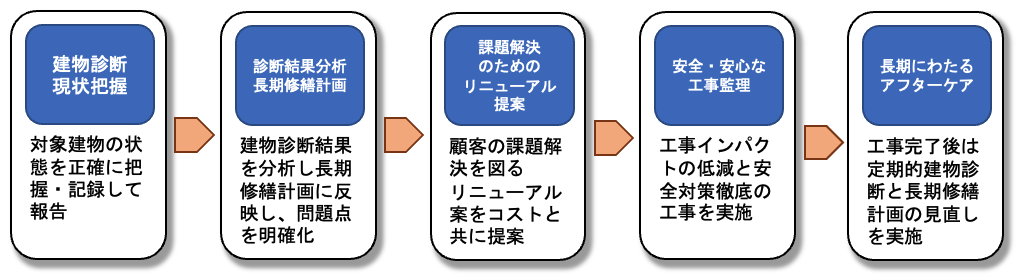 建物診断による現状調査・診断から始まり、診断結果を分析して長期修繕計画を作成し、お客様の抱える問題の解決策として複数のリニューアルプランを提案致します。
